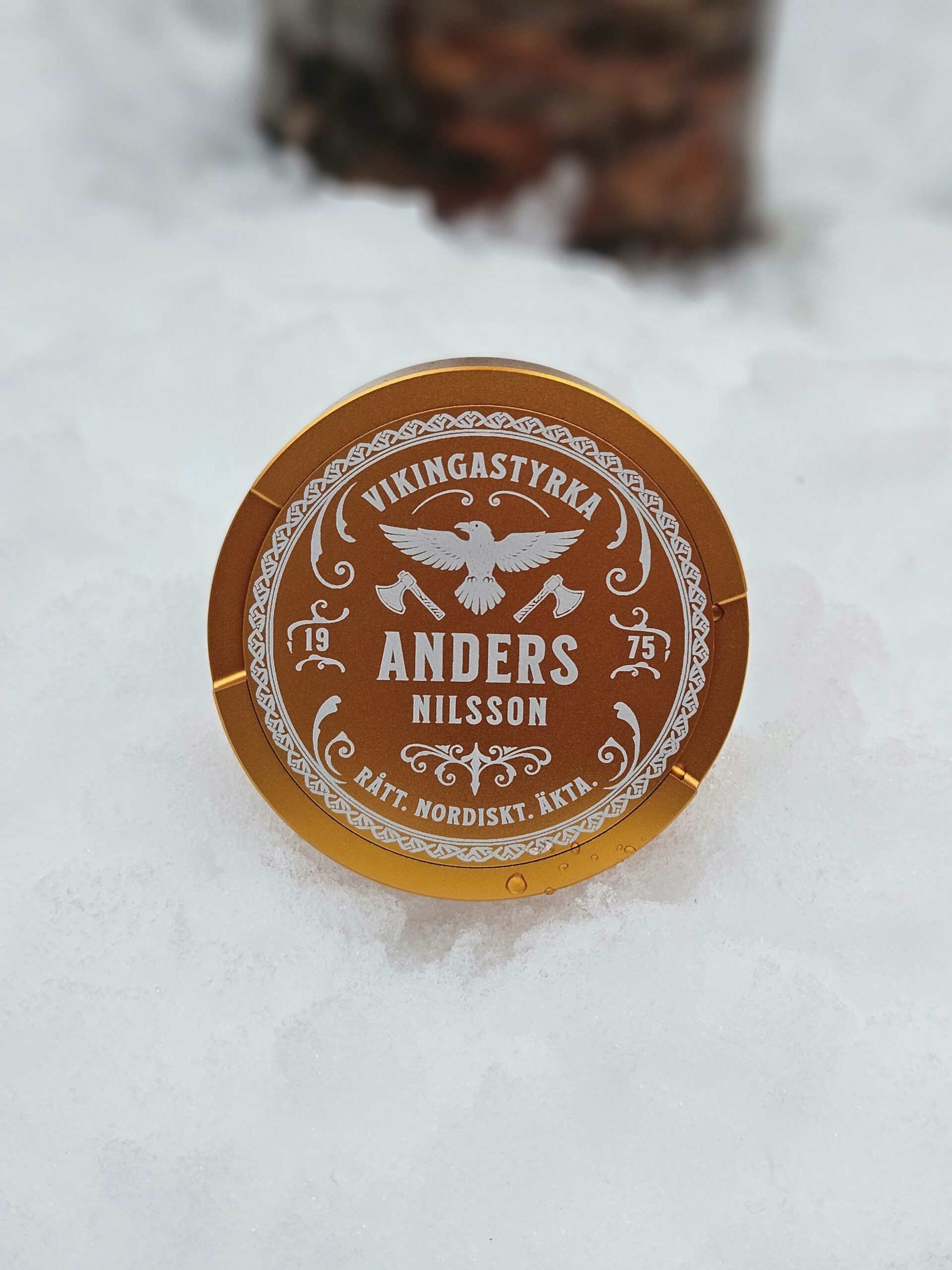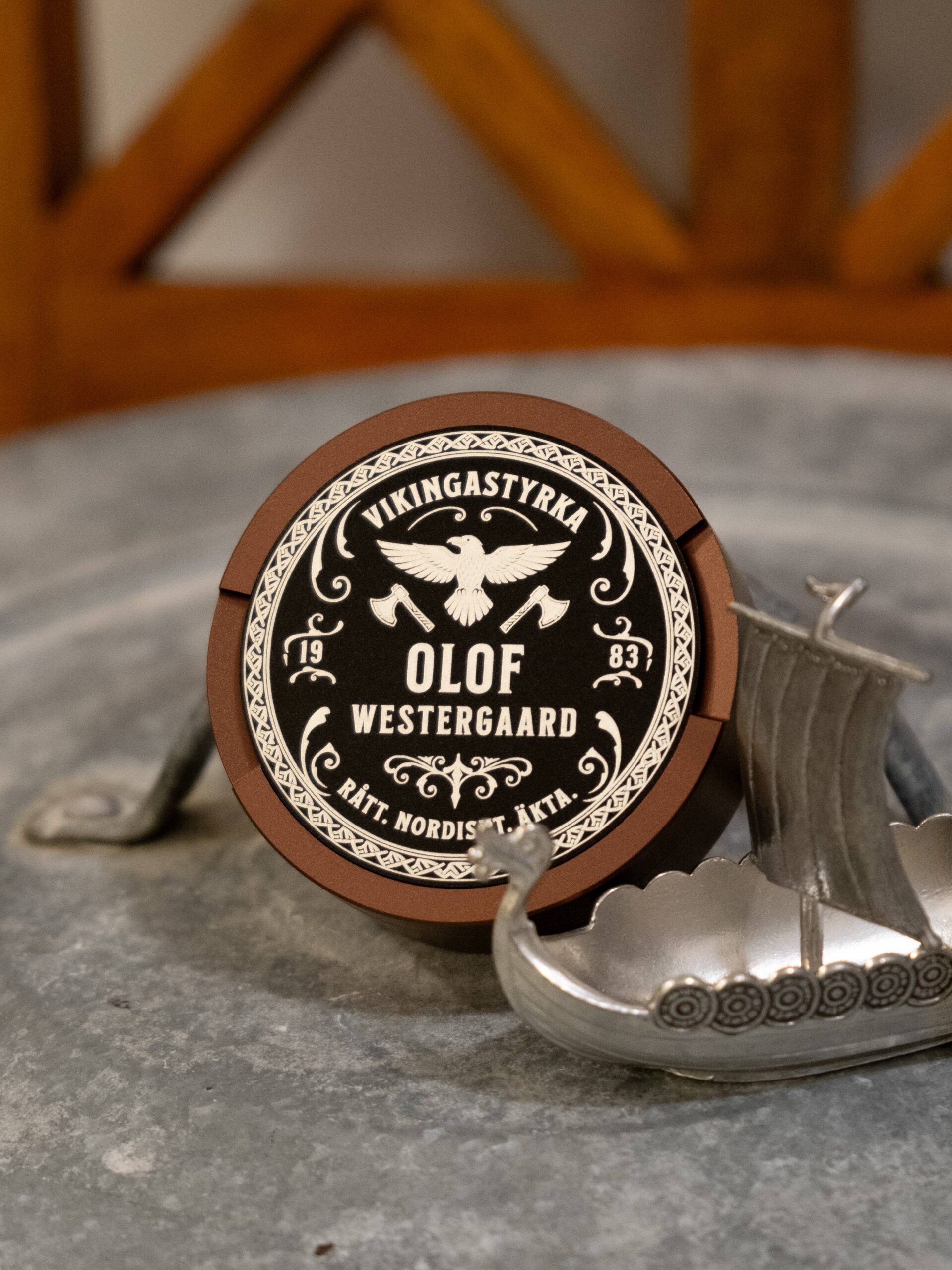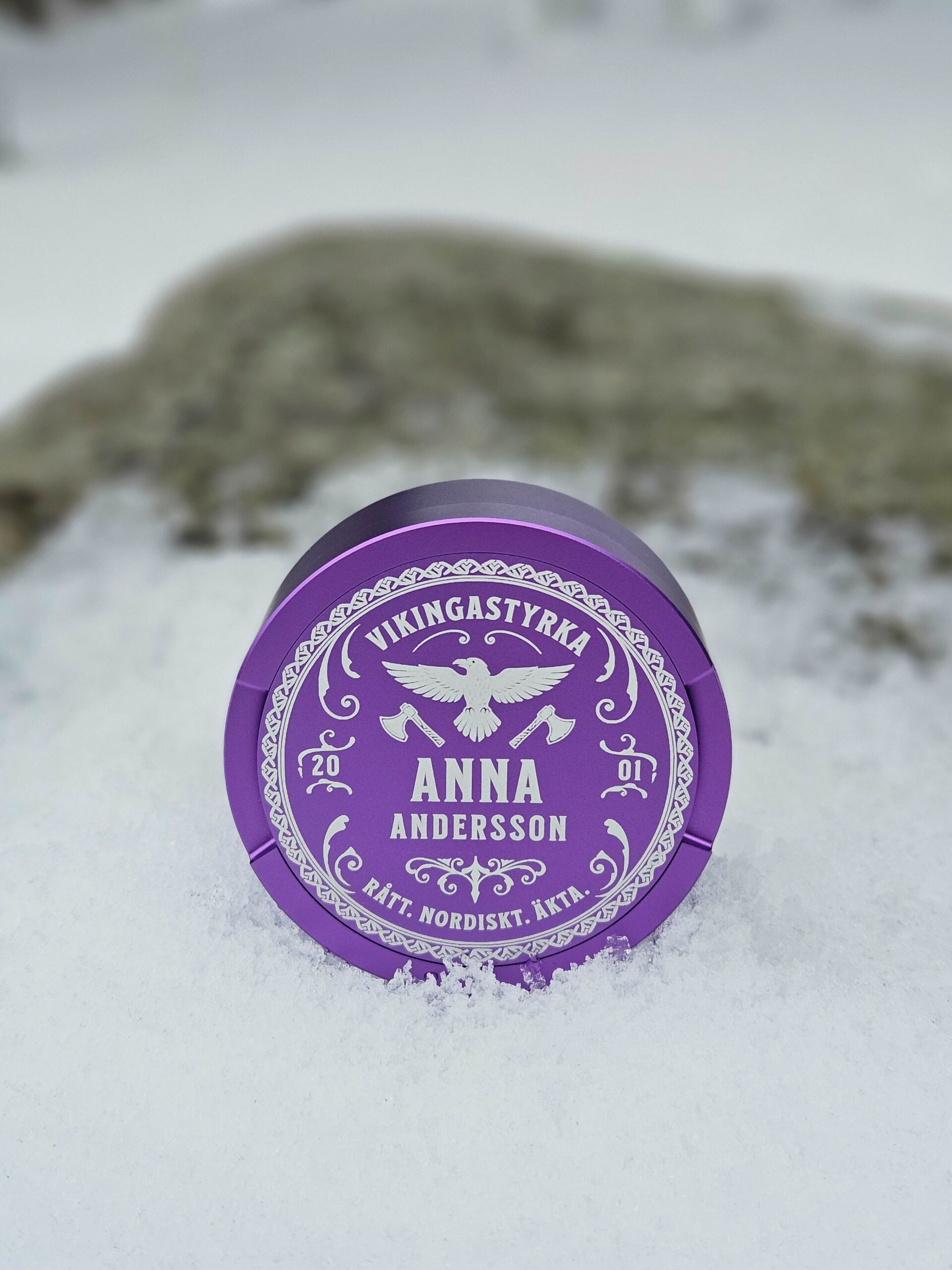 Skapa en personlig snusdosa med en vikingainspirerad design. Lägg till ditt namn och år för att göra den helt unik.
